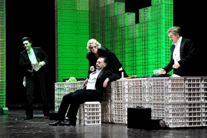 Lo spettacolo – passato al Teatro Verdi di Padova – è costruito come un’opera di teatro musicale che si avventura fino ai siparietti da rivista, con movimenti coreografati, testi in forma di canzone, melodie corali e rapide evoluzioni scenografiche. Con bravura, il cast spinge sull’acceleratore della farsa e costruisce un affresco ironico e amaro dei rischi che stanno dentro le deviazioni del potere. Seguendo Brecht ed enfatizzandone gli effetti parodistici, Longhi ricrea una Chicago anni Trenta nella quale un gangster si afferma come leader politico seguendo le tappe dell’ascesa che fu storicamente di Hitler.