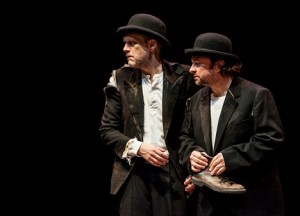 Questo gioiello dell’assurdo fatto parola, non per paradosso ma per provocazione, trova una particolare “esecuzione” nella peculiarità del tono. I due protagonisti sono clochard/clown disadattati, si spaventano per un nonulla, si deprimono con giri di parole che non sono ieratici e gelidi, ma sono quasi sempre ingenui e surreali. Il Vladimir impersonato da Ferrini si muove e si gratta il capo impacciato come Stan Laurel, mentre Balasso dà corpo a un Estragone svagato e sornione. E non scappa da ridere perché uno dei due finisca per esagerare, piuttosto perché le parole di Beckett appaiono strambe per loro natura.