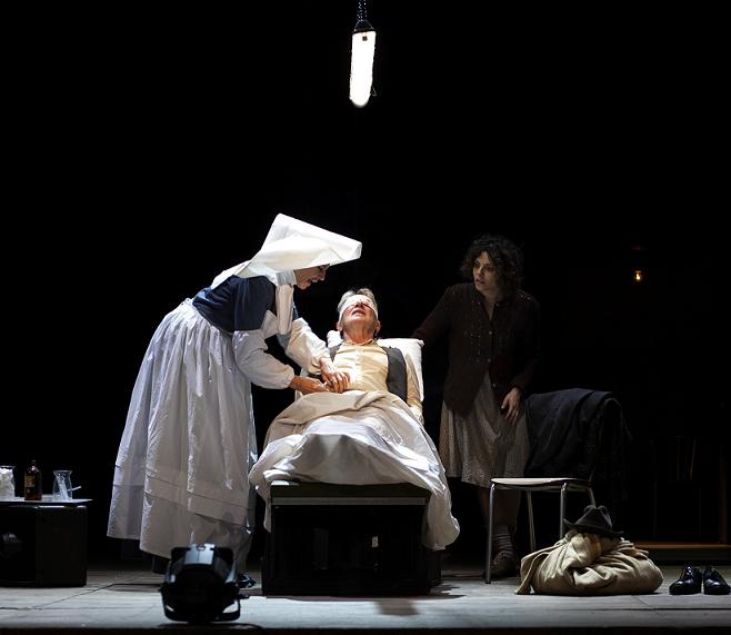 Quello che si può dire a priori è che la reinvenzione dell’Edipo a Colono di Sofocle scritta dalla Morante merita davvero di essere portata a impastarsi con i corpi sulla scena e con il suono delle parole. Perché pur se fortemente connotata da forme di ricerca linguistica poco teatrali e molto epocali – in linea con le tendenze di quegli anni verso una parola appoggiata sul significato, che travalica il significante drammaturgico – la pièce lascia spazio a un intervento di regia stimolante. Uno spazio che Martone coglie con abile ironia, dirigendo La serata a Colono con mano leggera e con un tratto netto, prendendo per le corna con maestria la presenza del coro dei matti (rimando alla tragedia antica) e facendone un punto di forza straordinario, scegliendo di popolare la sala di amabili psicotici un po’ sornioni, ciascuno con un tic o una fissazione esibiti a pochi centimetri dal pubblico. Interessante anche la ricostruzione dell’ambiente ospedaliero in cui l’autrice ripensa il monologo tragico dell’Edipo, con gli infermieri indolenti e il medico deus ex machina e la suora/infermiera pop che forse strizzano l’occhio a un immaginario onirico felliniano.