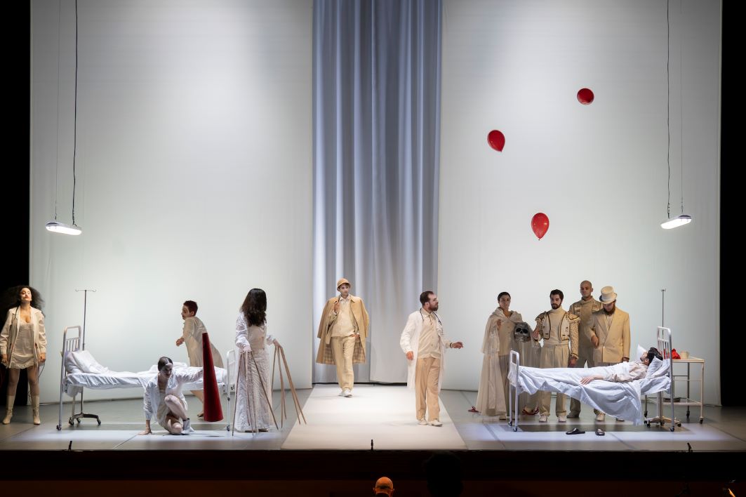 Alfred, Alfred è però anche una arguta auto-parodia, che si esprime già nella scelta dell’autore di trasferire sé stesso in scena nella parte di malato, ruolo muto interpretato da Giuseppe De Luca. Donatoni rievoca qui, in una specie di rito apotropaico, cioè di allontanamento della morte da sé, un periodo di degenza trascorso in coma diabetico in un ospedale australiano. Quella che si affaccia ai nostri occhi non è una storia, ma una sequenza di epifanie grottesche dentro una nuda stanza d’ospedale, “istituzione totale” in cui medici, infermiere e amiche-visitatrici formano un iperbolico teatro dell’assurdo. L’ideazione di Muta Imago e la regia e scenografia di Claudia Sorace conferiscono a questa misteriosa umanità, entro una luce fredda e spettrale variata da effetti stroboscopici, l’aspetto di un’efferata galleria semi-umana tra il clownesco e il punk, tra il tronfio e il borioso, efficacemente amplificata, per ogni soggetto, da enormi videoritratti auto-caricaturali proiettati su due grandi schermi sghembi. Essi fungono anche da fondali uniti da un micro-sipario, da cui fuoriescono come in un incubo lo staff del micro-cosmo ospedaliero e i visitatori del degente, impersonati da interpreti tutti in ottima forma, vocalmente e attorialmente: Maria Eleonora Caminada, Elena Coscia, Samantha Faina, Michele Gianquinto, Clara La Licata, Matilde Lazzaroni, Liga Liedskalnina, Niccolò Roda, Elena Tereshchenko, Chiara Ersilia Trapani. Essi entrano in scena, soli o in gruppo, recitano e cantano come in una misteriosa sfilata carnevalesca, dove non mancano donne pluri-mammellate, ittiomorfe o aracniformi, a chiarire la natura ironica e onirica, seducente e teratologica, della esorcizzante visione donatoniana.