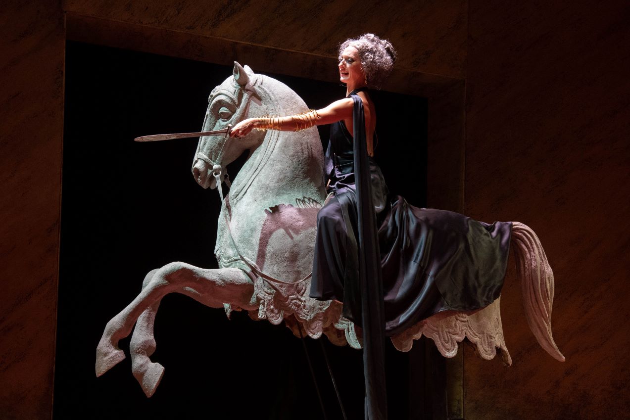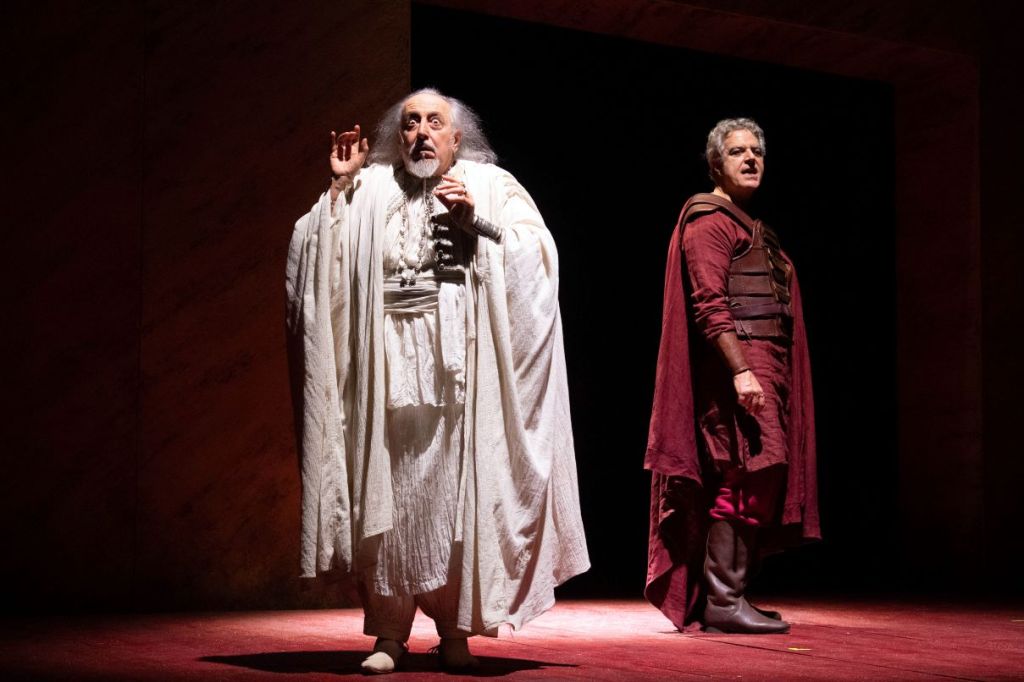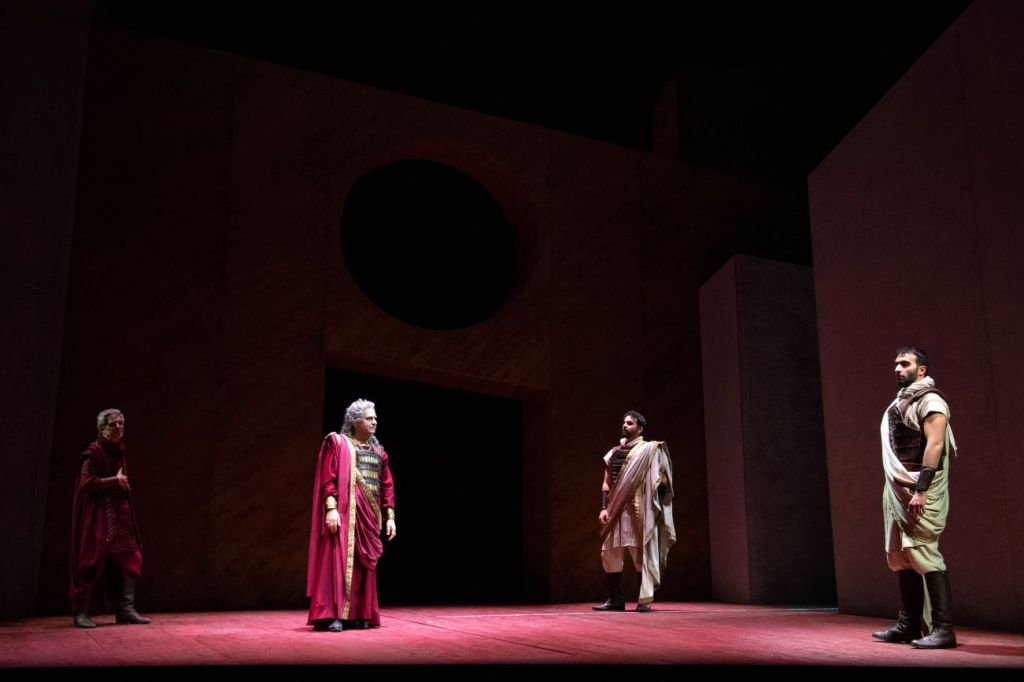 Dai toni grotteschi, quasi da atellana, dell’inizio, si poteva supporre di assistere a una versione post-decadentistica, tutta eccessi e iperboli visive. Invece, dissimulata dai bei costumi di Carlo Poggioli e incastonata nella scena tra metafisica e post-futuristica firmata da Margherita Palli, si fa strada una regia temperata, che serve il testo e gli attori dando libero corso ai diversi talenti di ciascuno. L’Enobarbo di Danilo Nigrelli ha variegate sfumature di umanità e toccanti capacità di esprimere laceranti conflitti interiori. L’Indovino di Massimo Verdastro è di magistrale misura ed equilibrio, in un ruolo che poteva indurre a una sobrietà ironica che lo sottraesse facilmente al rischio dell’enfasi. Veggente inascoltato e malinconico, con i suoi rochi tremolii vocali e il penetrante fatalismo della sua dizione lieve e sensibile, egli è il solo a farsi veicolo di amare verità sulla ineluttabilità del destino stabilito per gli umani dalla divinità.