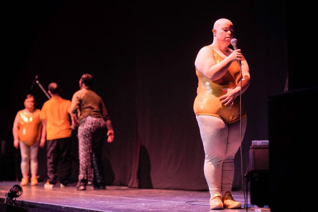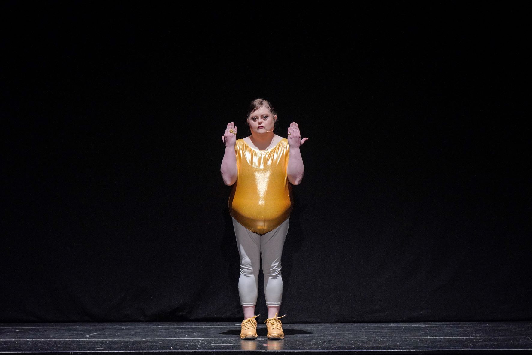 Ma il vero significato dello spettacolo, ciò che lo qualifica nella sua dolorosa originalità, è nella costruzione scenica e visiva e nel ruolo fondamentale che in esso ha la musica. Per tutta la prima parte il sipario rimane abbassato e lo spazio scenico risulta quello, limitatissimo, della ribalta, dove compaiono quattro personaggi: i due manigoldi, entrambi abbigliati in modo da parere farseschi esecutori di un disegno impenetrabile; la vittima, di sesso femminile, scarmigliata e rattrappita su stessa, e il “gestore” del microfono, un personaggio in possesso di un impressionante volto, e modi conseguenti, da inappuntabile maggiordomo di una nobile famiglia britannica nell’epoca dell’impero. Questi ha appunto il solo compito di portare il microfono alle parti, e cioè agli offensori per far loro pronunciare l’aborrito insulto, poi alla vittima per tentare una debole autodifesa. Siamo di fronte a un tipicissimo body shaming: quel che viene imputato alla vittima è di essere grassa, benché la realtà dica il contrario.