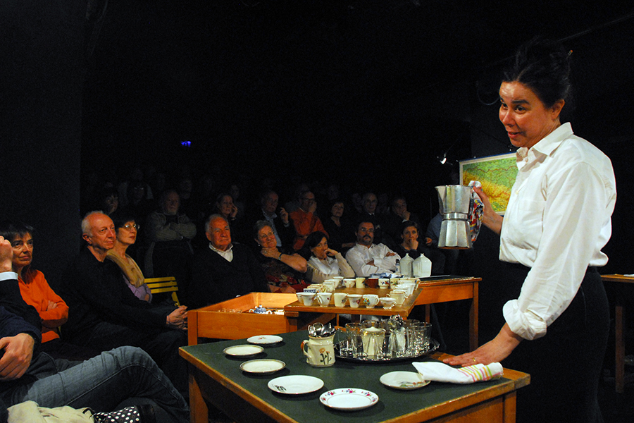 OLINDO RAMPIN | L’odore del secolo scorso ci viene subito incontro con questa scrivania di ardesia, le carte geografiche appese, i vecchi banchi di scuola. Laura Cleri, autrice e interprete dello spettacolo prodotto dal Teatro Due di Parma, vi aggiunge alla fine anche l’odore del caffè. Lo prepara lei stessa, con due vecchie caffettiere, passo dopo passo, e lo serve in vecchie tazzine col piattino, tutte diverse. Mentre lo beve, il pubblico, vecchio e giovane, seduto ai tre lati della scena quadrata diventata, da aula scolastica, salotto, non sa che una di quelle caffettiere è un dono fatto alla narratrice da Laura Seghettini, scomparsa nel 2017, di cui Un’eredità senza testamento ripercorre l’esperienza di partigiana.