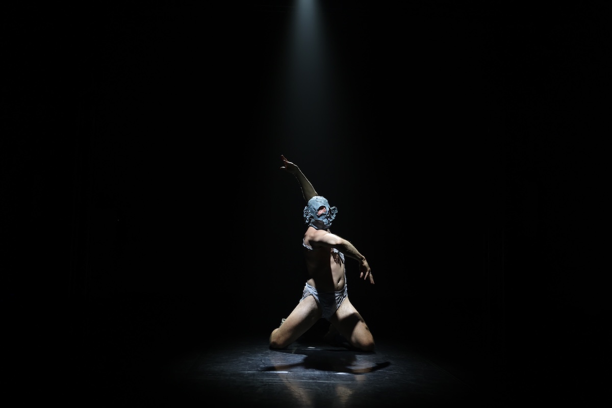 La prima parte di Threesome, diretto e interpretato da Wojciech Grudziński, andato in scena al Teatro della Misericordia, è un lungo e appassionato inno al posteriore maschile. Ad esso l’artista polacco affida il ruolo di protagonista assoluto di un lungo assolo, performato in una postura di arduo contorsionismo. In testa un cappuccio azzurro con orecchie d’animale, incrocio stile bondage e slip di pizzo, il poderoso performer compone un manieristico sottinsù in cui il deretano è la parte superiore di una figura antropomorfa di cui si vede solo la schiena. Isolata da una luce teatrale che ne illumina la progressione di moti e sussulti, questa danza dei glutei culmina con una franca, decisa ostensione al pubblico dell’orifizio anale del danzatore.