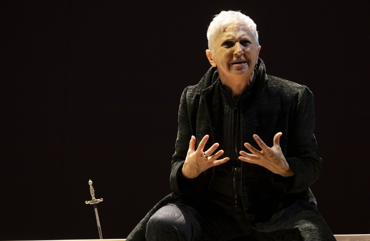 Qui troneggia Maria Paiato, pronta a restituire la natura selvaggia del suo personaggio con un furore che domina la scena: il suo Riccardo “in nero”, claudicante e gobbo, destinato a non essere mai re se non con la violenza, reclama con forza il suo diritto a sovvertire le immutabili regole della successione e di “essere” in un mondo in bilico sull’abisso. Riccardo sfida, provoca, assale, persuade e manipola chi gli ruota attorno, mente sembrando sincero, persino con se stesso.